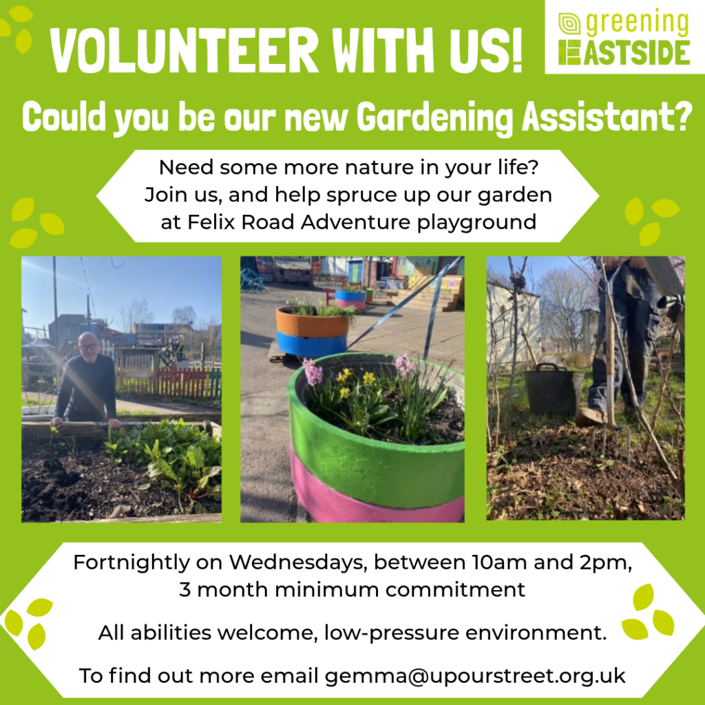 We are looking for enthusiastic people with a love for gardening who can assist our part time gardener at Felix Road Adventure Playground.